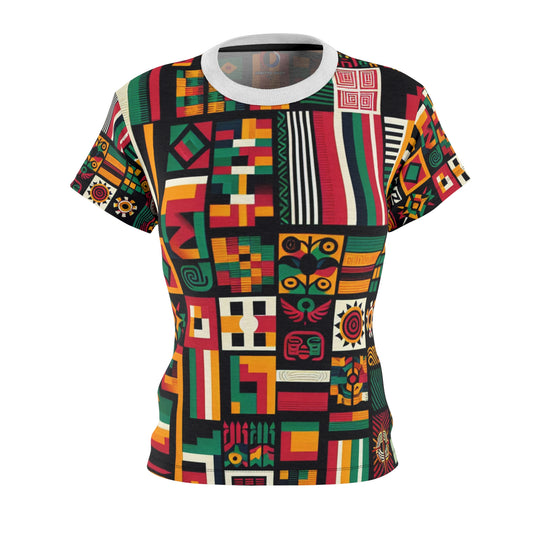 Vibrant African Storytelling Geometric-Pattern Women's T-shirt – Bold Colors & Tribal Symbols Shirt - African Tribal Pattern-Inspired