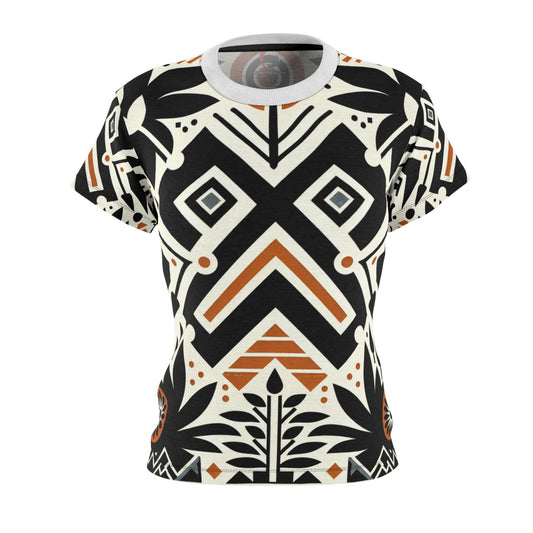 Modern African Fusion Women's Tee: Monochromatic, Orange Accents, Nature-Inspired Graphics - African Tribal Pattern-Inspired
