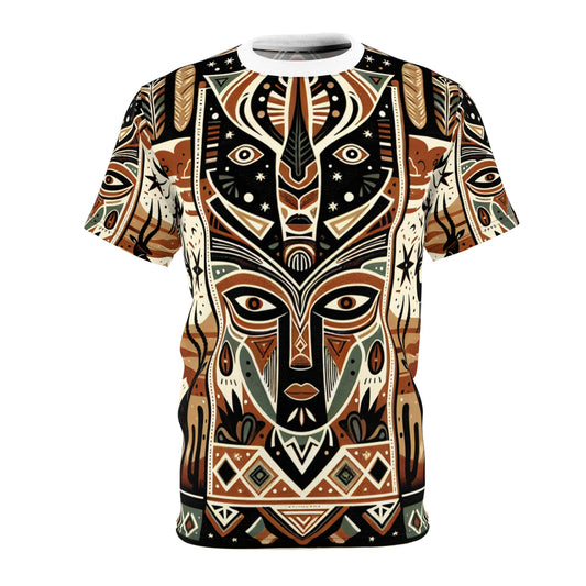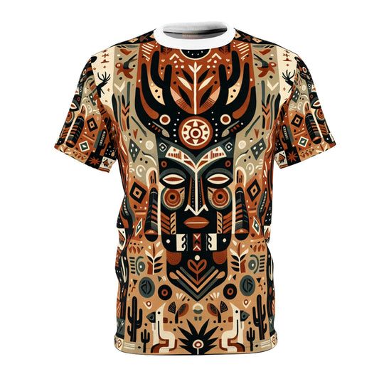 African-Desert Fusion Tee: Tribal Totem and Southwest Nature Tapestry in Earthy Tones - African Tribal Pattern-Inspired