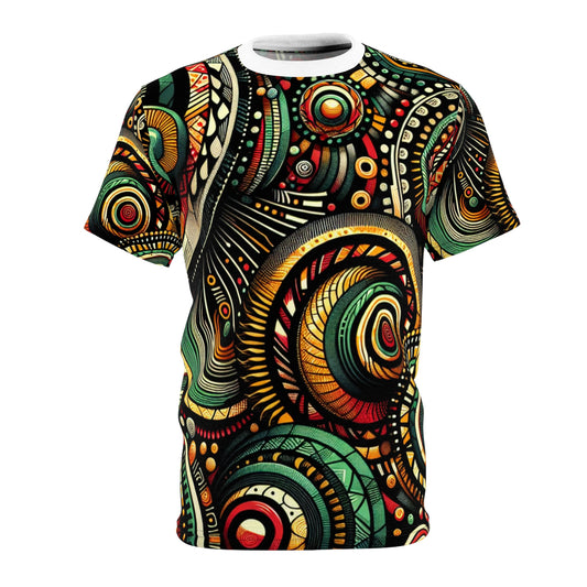African Rhythm Dance Party T-Shirt: Bold Circles & Radiating Lines in Vibrant Hues - African Tribal Pattern-Inspired Tee