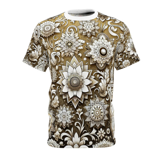 White & Gold Indian Motif Collection: Intricate Floral & Geometric Patterns on Seamless T-Shirt - Modern Minimalist Design on Traditional Indian Heritage Tee