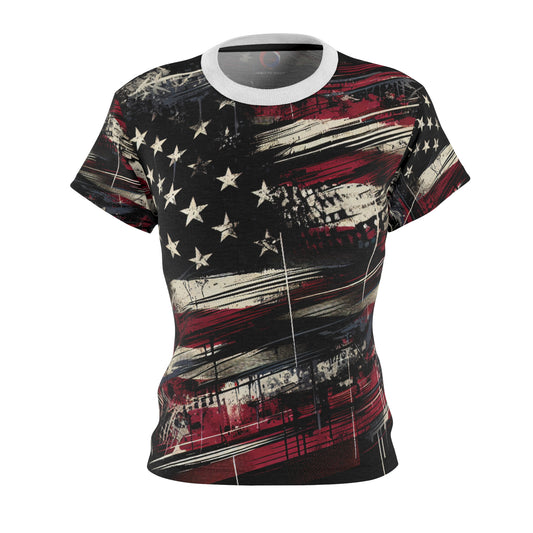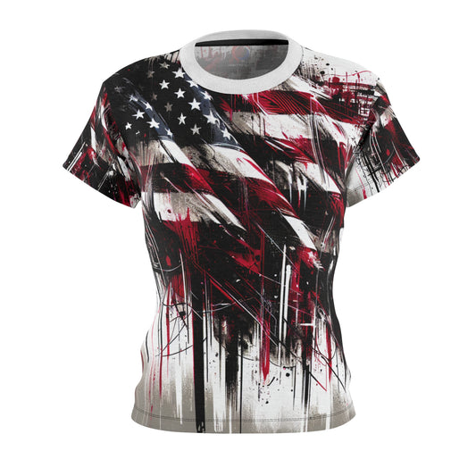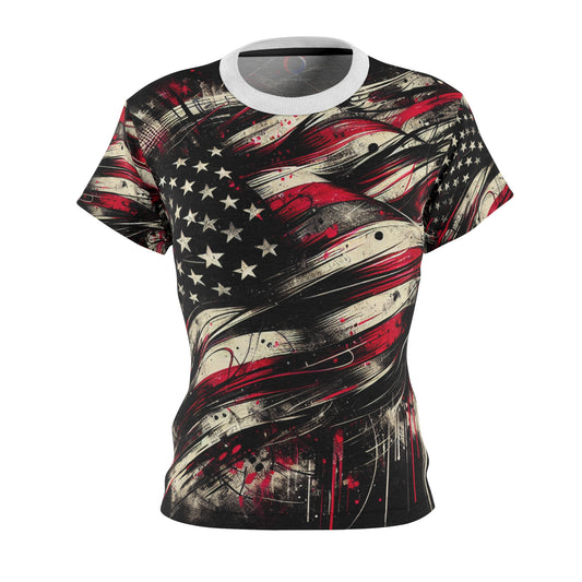 Distressed American Glory: Edgy Graffiti-Styled USA Flag Women's Tee for Bold Streetwear Fashionistas - Patriotic Streetwear
