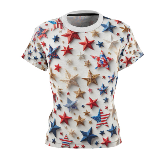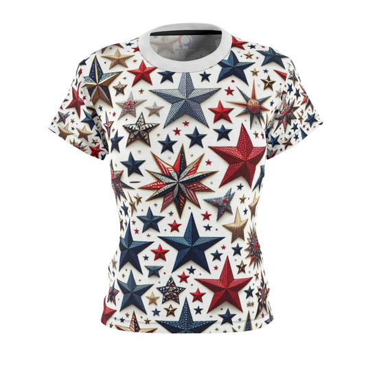 Festive Patriotic Star Pattern Women's T-Shirt - Red, Blue & Gold Celebration Top for Independence Day - Patriotic Streetwear Tee