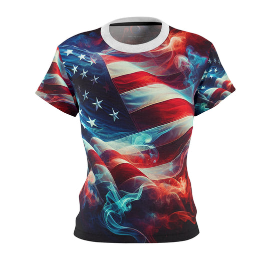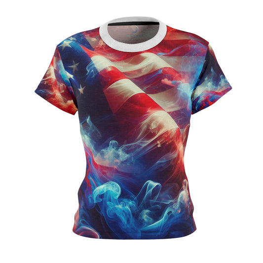 Mystic Smoke & Flag Women's T-shirt: Artful USA Pride in Transitioning Deep Red to Rich Blue - Patriotic Streetwear Tee