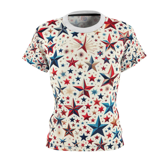 Women's Joyful Patriotic Star-Scattered T-Shirt - Vibrant Red, Blue & Gold for Festive Celebrations - Patriotic Streetwear Tee