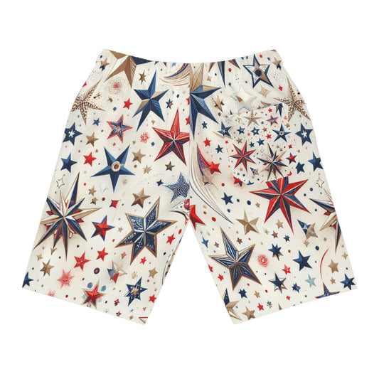 Star-Spangled Festive Shorts - Patriotic Red, Blue, Gold Star Prints on White, Perfect for Independence Day Celebrations - Patriotic Streetwear Shorts