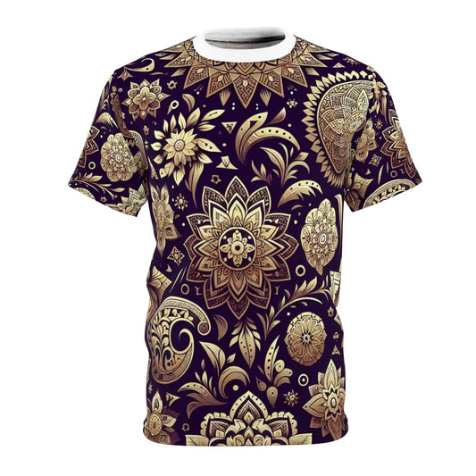 Premium Ethnic Gold & Purple T-Shirt with Traditional Indian Motifs - Seamless Pattern Design with Intricate Floral and Geometric Shapes - Luxurious Reflect Tee