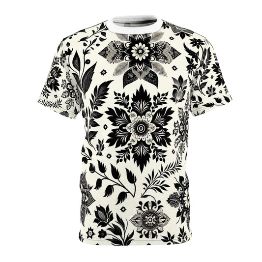 Classic Indian Heritage-Inspired Seamless Motif T-Shirt - Intricately Designed Black & White Pattern - Traditional Indian Motifs Tee