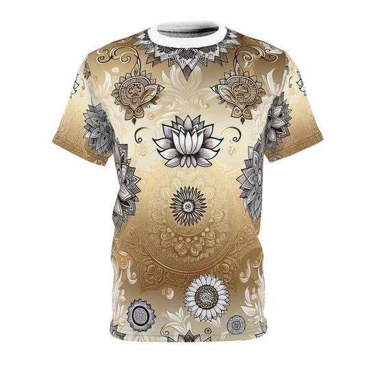 Golden Heritage T-Shirt: A Seamless Fusion of Traditional Indian Motifs in Reflective Gold and White