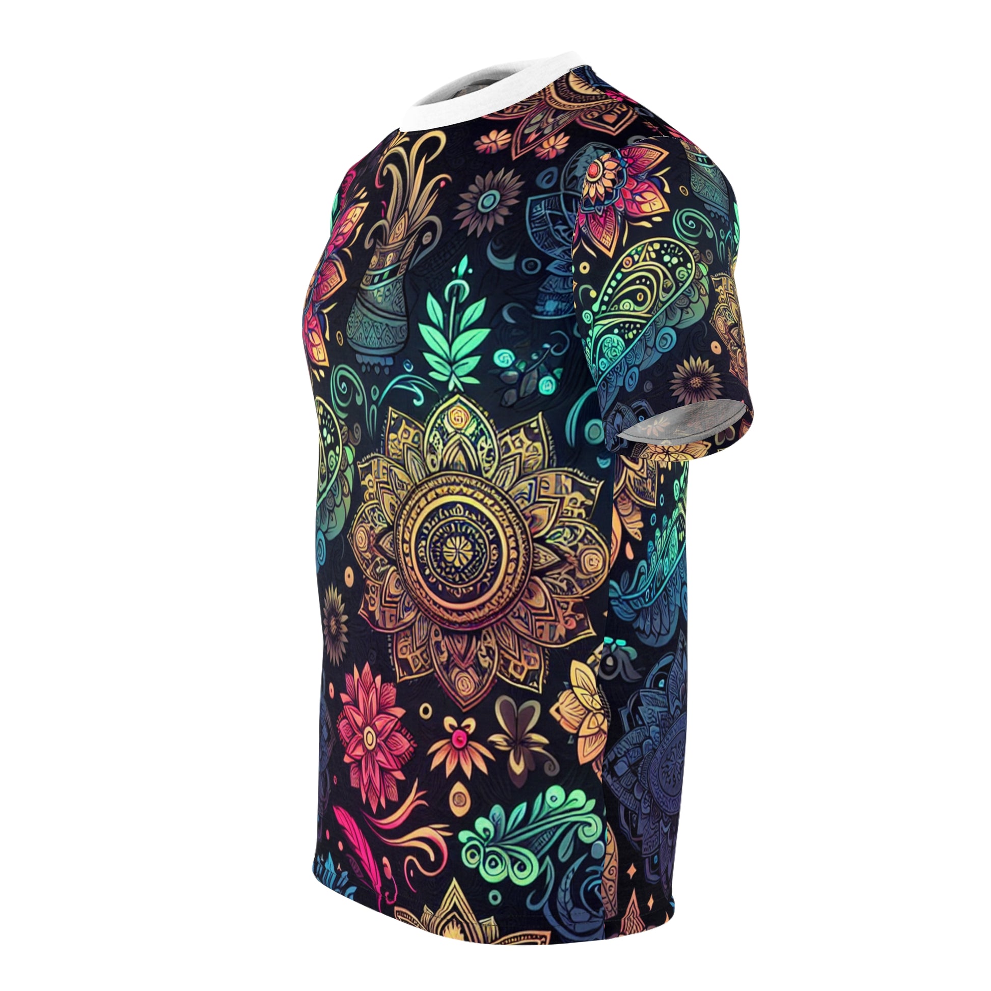 Discover the magnetic intrigue of our UV-reactive Indian Motif T-Shirt. Scattered traditional Indian designs weave an intricate dance of geometric and floral elements, imbued with a vibrant neon glow under blacklight. Witness the fusion of India's rich design heritage and cutting-edge bioluminescent technology set against a sleek black backdrop. Feel the modern minimalistic allure, balanced by the depth and variety of the motifs' design. #UVReactiveTShirt #IndianMotifDesign #BioluminescentApparel #NeonFashion #ModernIndianDesign #UVGlowApparel #BlacklightClothing #TrippyIndianPattern #IntricateApparel #VibrantFashion #PsychedelicIndia