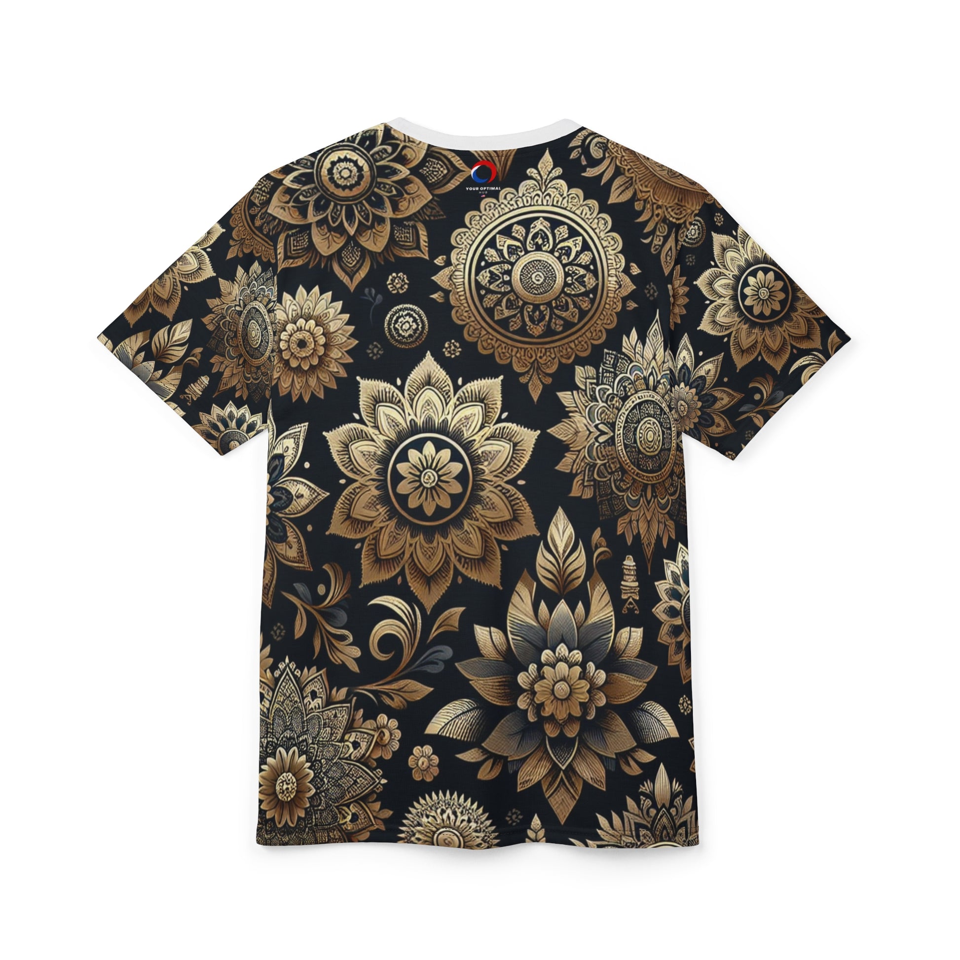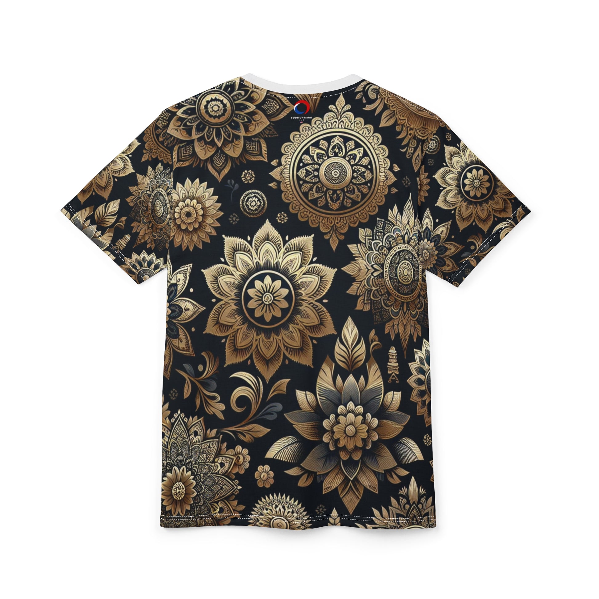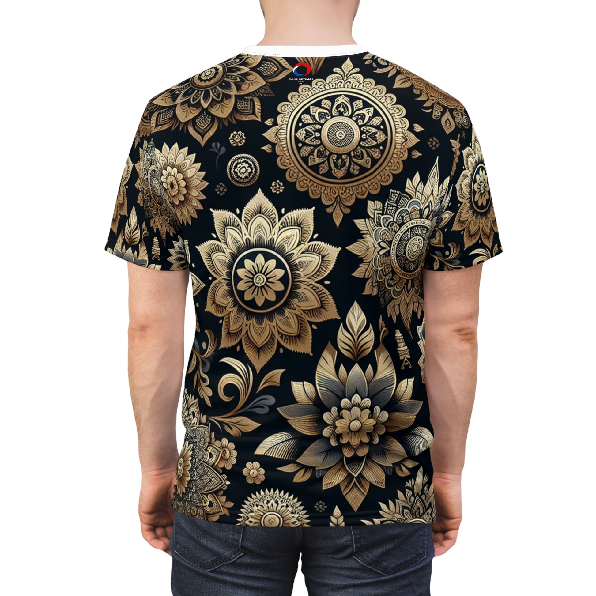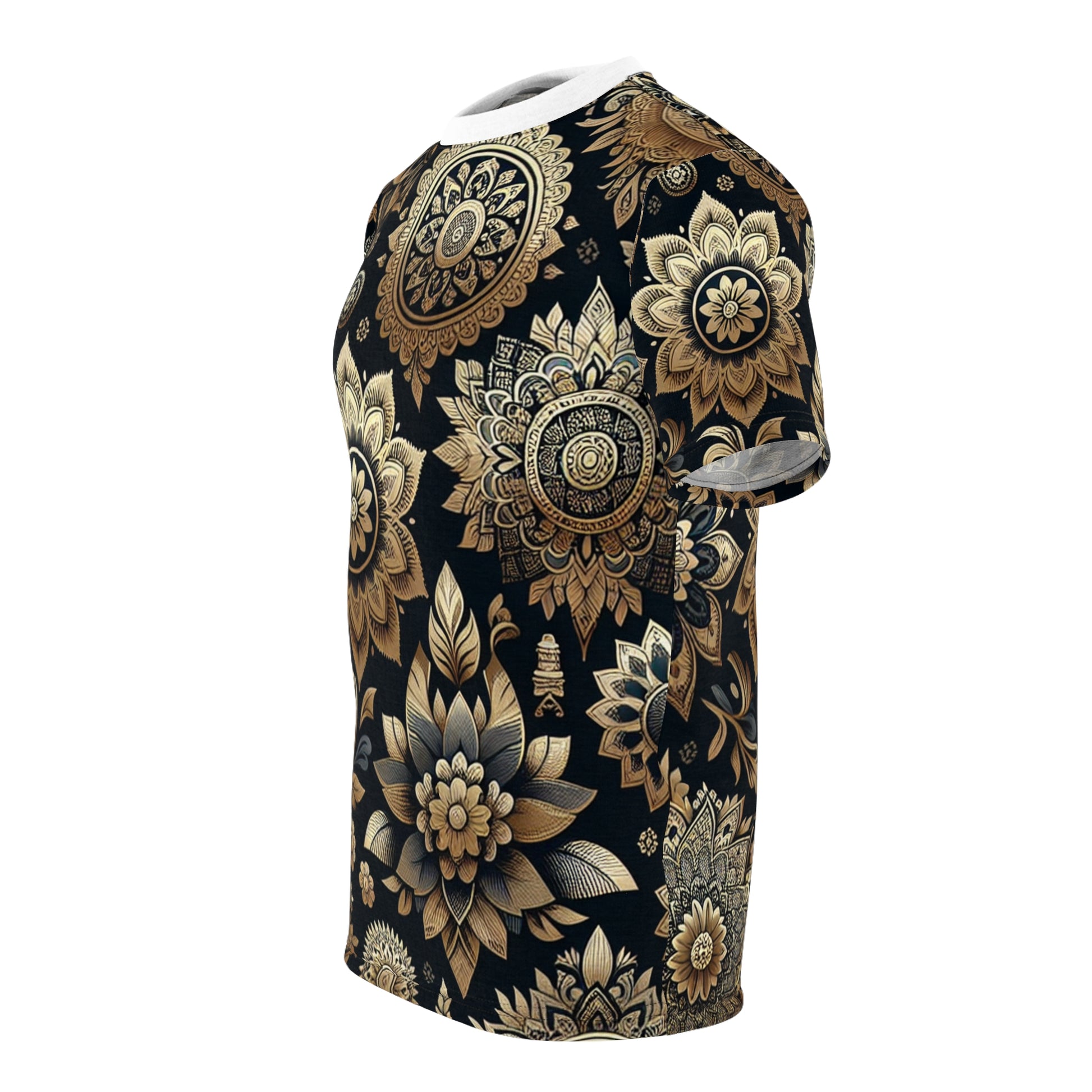 Gold on Black Indian Pattern Tee – Reflective Floral & Geometric Motif Design Shirt
