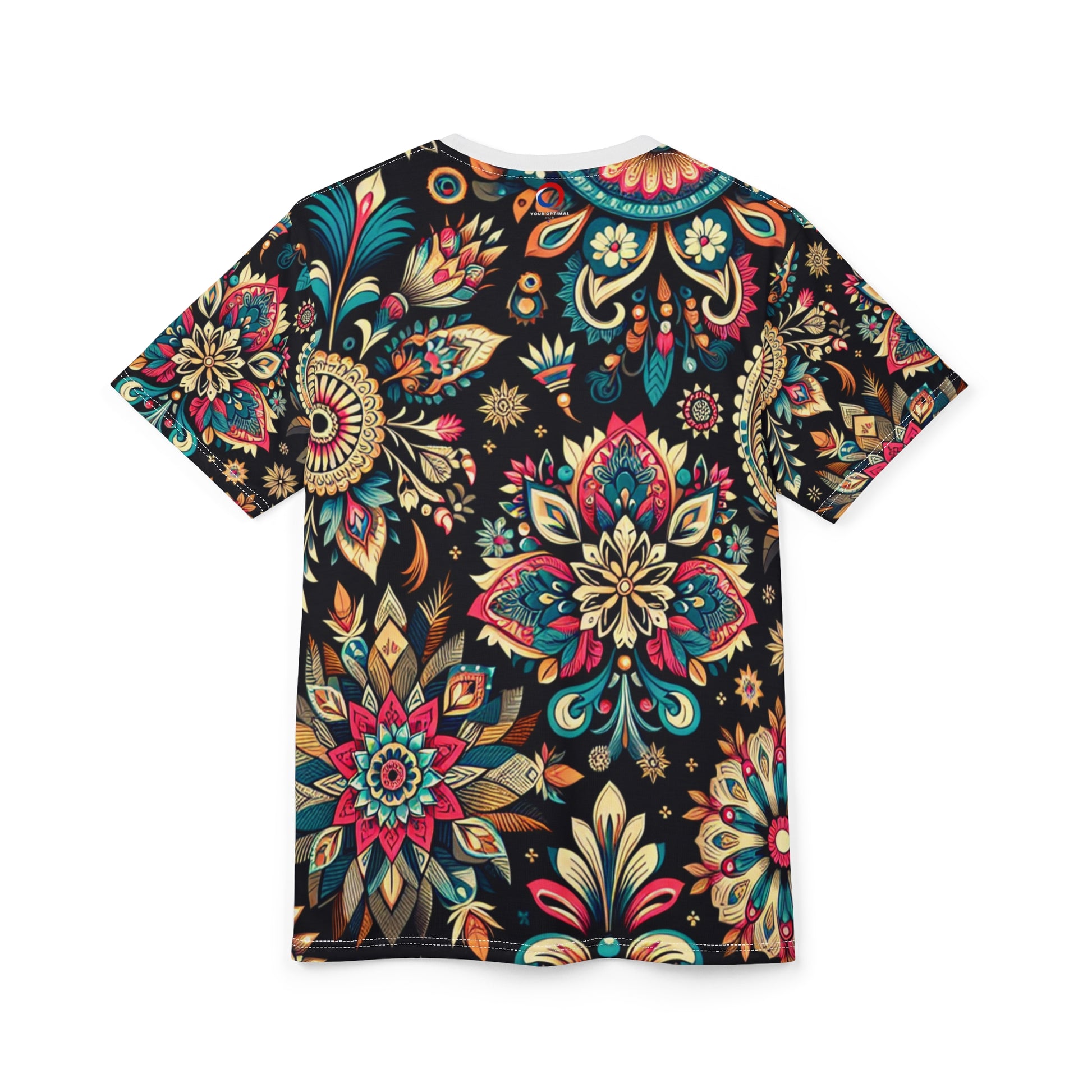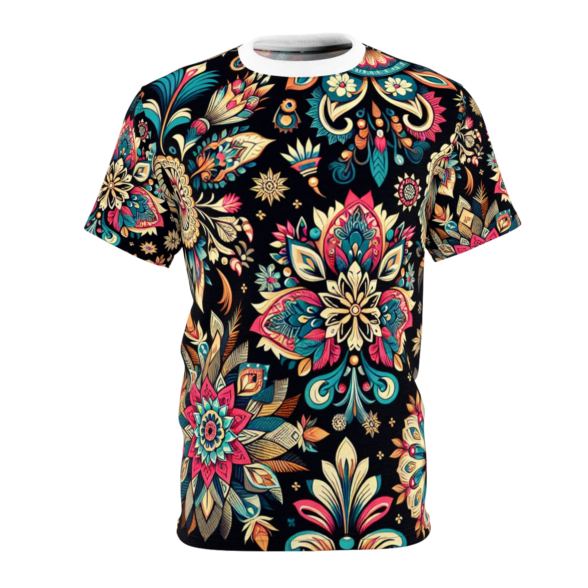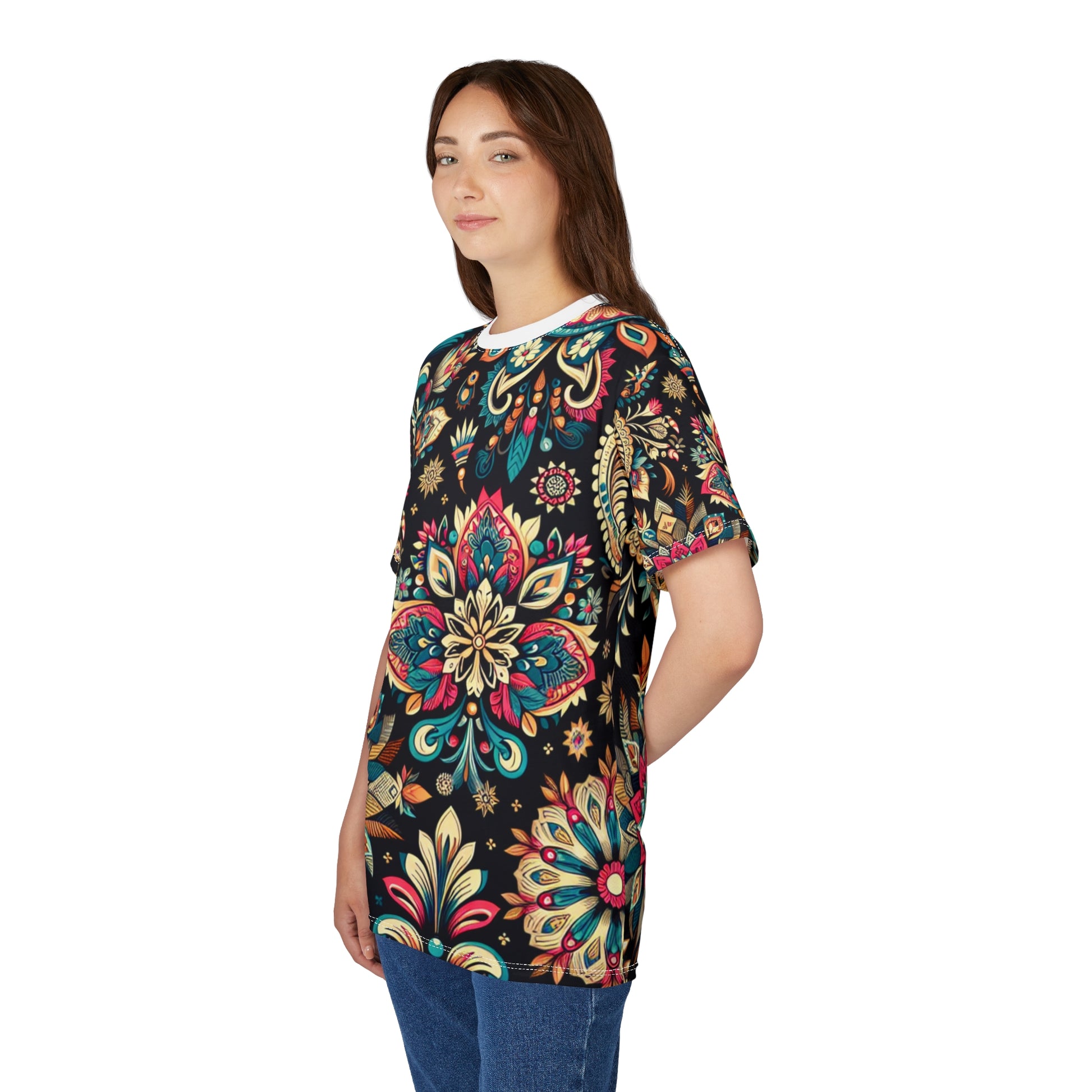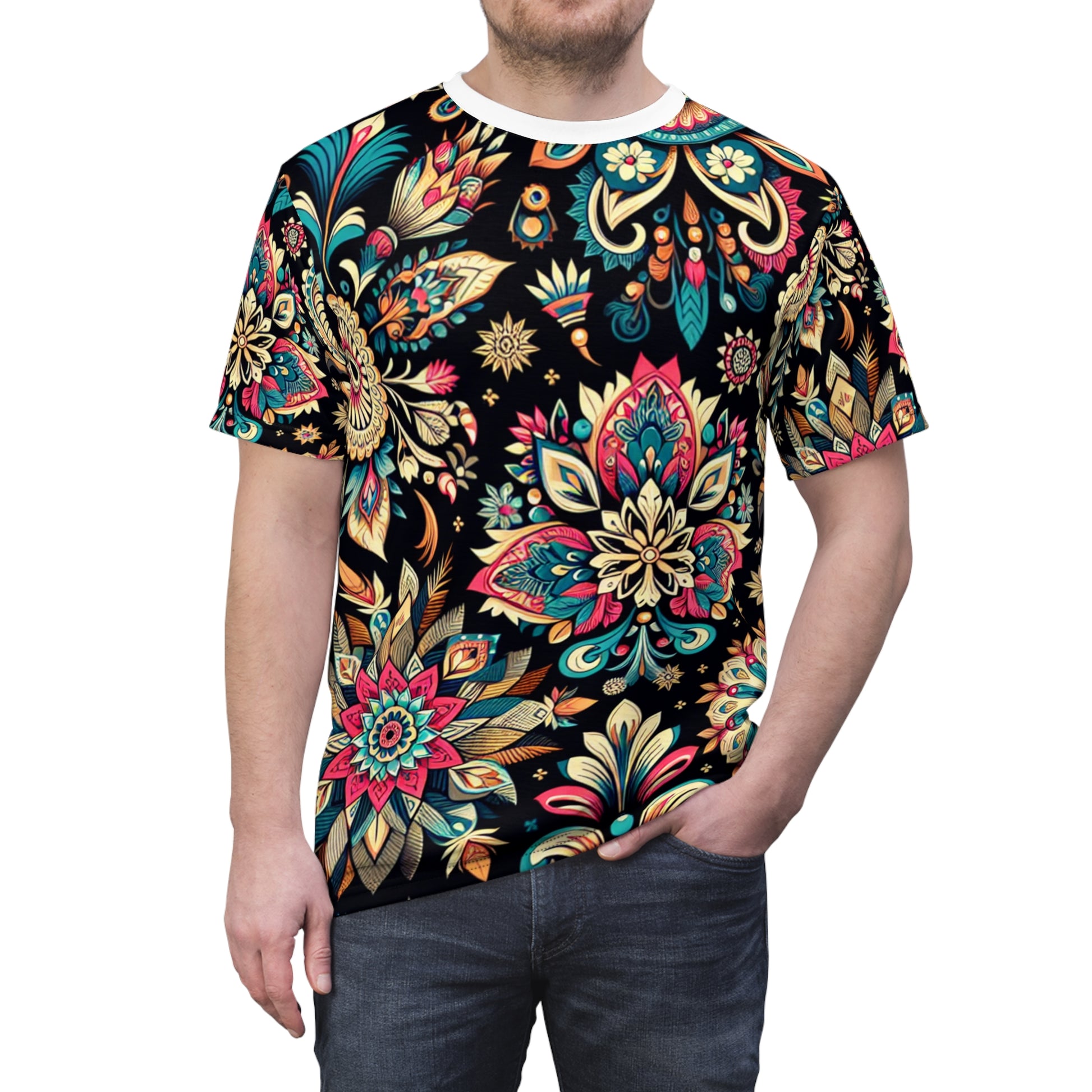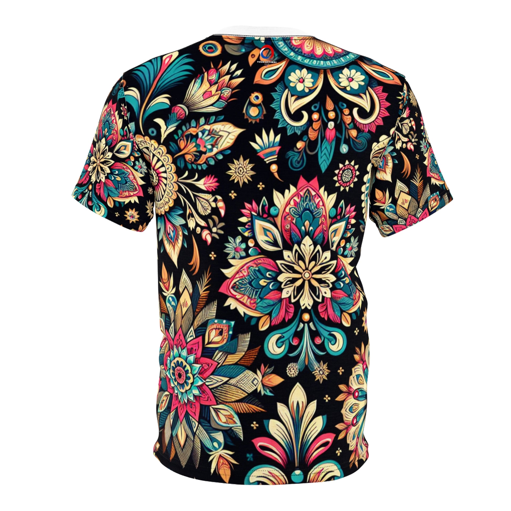 UV Reactive Boho-Chic T-Shirt with Intricate Neon Indian Motifs on Black Background - Scattered Geometric Floral Design