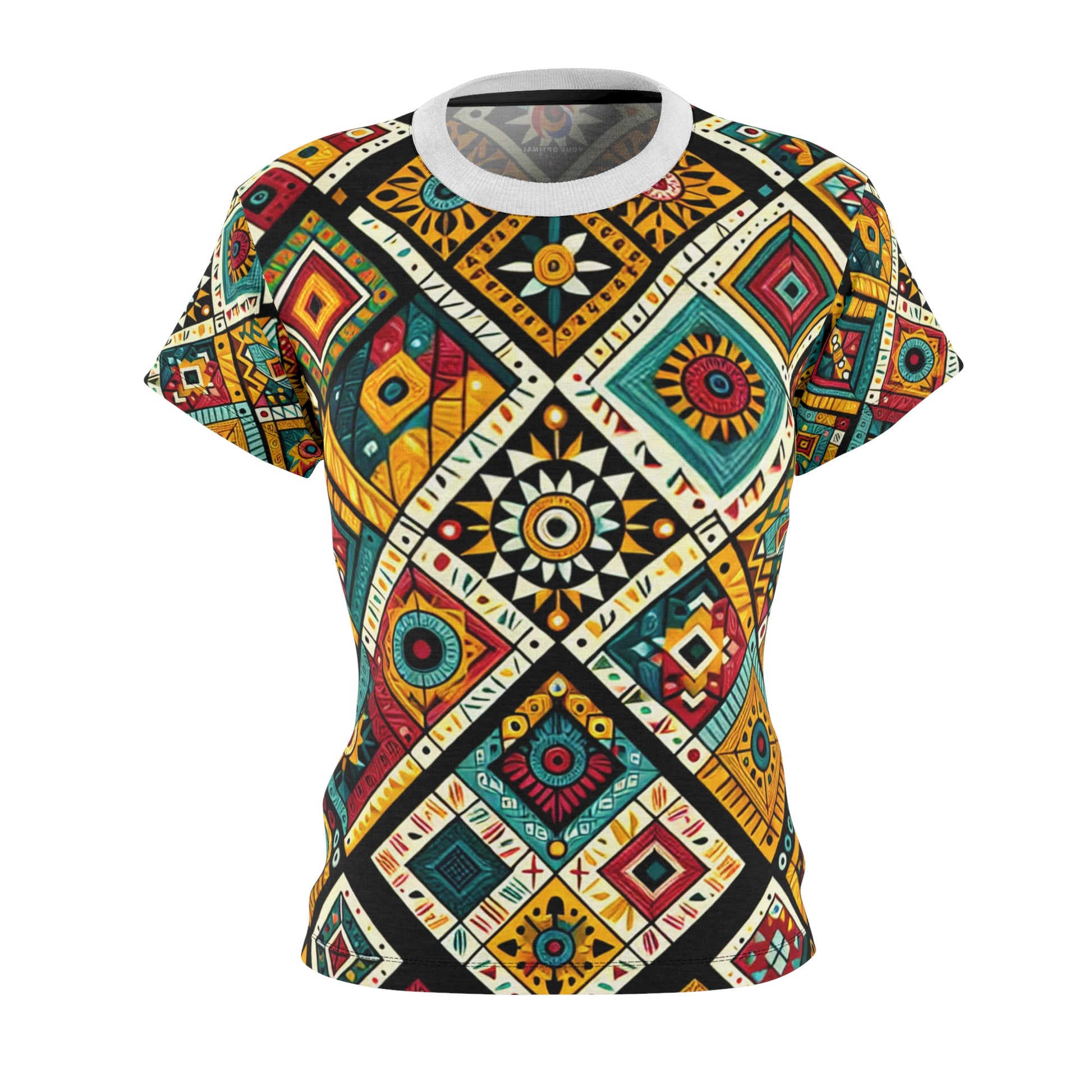 Vibrant African Storytelling Geometric-Pattern Women's T-shirt – Bold Colors & Tribal Symbols Shirt - African Tribal Pattern-Inspired